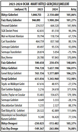 Aşağıdaki tabloda 2023 ve 2024 yıllarına ait Ocak-Mart ayları bütçe kalemlerindeki gerçekleşmeler ve artış oranları yer alıyor.