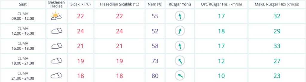 Meteoroloji Genel Müdürlüğü günlük hava durumu raporuna göre; İzmir’de 19 Nisan Cuma günü bulutlu havanın etkili olmasıyla birlikte yer yer güneşin de etkili olacağı öngörülüyor. Sıcaklıkların gün içinde en düşük 18, en yüksek 24, derece olacağı günde hissedilen sıcaklık seviyesinin de 24 derece seviyelerinde seyir etmesi planlanıyor. Günlük nem dengesinin yüzde 80 seviyesinde seyir edeceği günde ortama rüzgar hızının saatte 18 maksimum rüzgar hızının ise saatte 33 kilometreye kadar çıkacağı öngörülüyor.