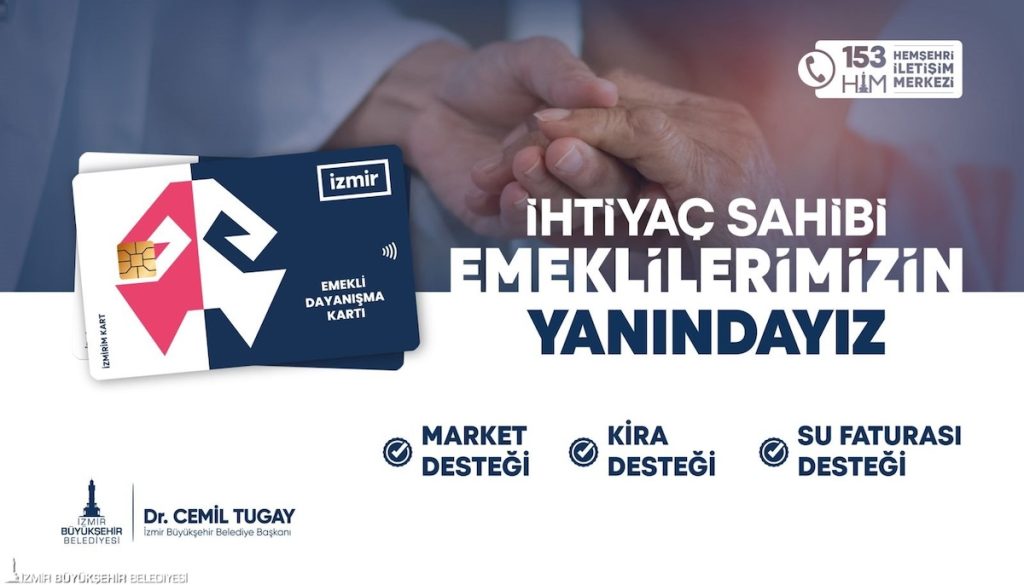 İzmir Büyükşehir Belediyesi bu hizmetle ihtiyaç sahibi olduğu tespit edilen emekli yurttaşlara su faturası, kira ve market desteği sağlayacak. Hazırlanan kartlar, Büyükşehir Belediyesi ekipleri tarafından vatandaşlara ulaştırılmaya başlandı. Uygulama kapsamında ilk etapta su faturası desteği faaliyete geçti. İhtiyaç sahibi emekliler en kısa sürede kira ve market desteğinden de yararlanabilecek.