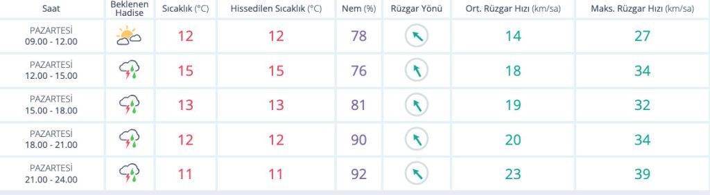 Meteoroloji Genel Müdürlüğü (MGM) günlük hava durumu raporuna göre; 23 Aralık Pazartesi günü İzmir’de sıcaklıklar düşüş yaşamaya devam ederken, gün boyunca yağmurlu havanın etkili olması bekleniyor. Sıcaklıkların gün içinde en düşük 11, en yüksek 15 derece olacağı günde hissedilen sıcaklık seviyesinin de maksimum 15 derece seviyelerinde seyir etmesi planlanıyor. Günlük nem dengesinin yüzde 92 seviyesinde seyir edeceği günde ortama rüzgar hızının saatte 23 maksimum rüzgar hızının ise saatte 39 kilometreye kadar çıkacağı öngörülüyor.
