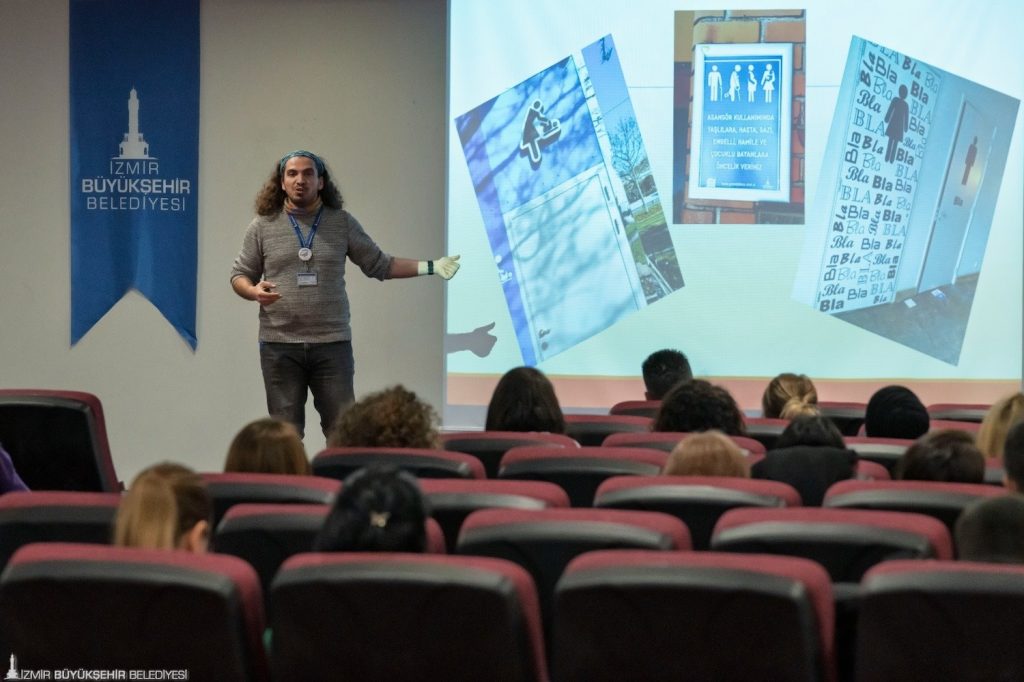 Kadın Çalışmaları Şube Müdürlüğü Toplumsal Cinsiyet Eşitliği Birimi’nden Çağla Çağlar, “İzmir Büyükşehir Belediyesi bünyesinde çalışan personele destek sağlamak üzere Şiddete Karşı Sıfır Tolerans Kurum Politika Belgesi hazırlandı. Genel hedefimiz, bir kurum kültürü yaratmak. Bu kapsamda hizmet içi eğitimlerimiz karma gruplarla yapılıyor. Eğitimlerimiz kadına yönelik şiddetle mücadele, toplumsal cinsiyet eşitliği, insan hakları gibi konuları kapsıyor. Aynı zamanda kurum politika belgesinin yaygınlaştırılması ve duyurulmasını sağlamak üzere çalışmalar yürütüyoruz. İzmir Büyükşehir Belediyesi olarak ‘Şiddete karşı sıfır tolerans’ diyoruz” dedi.