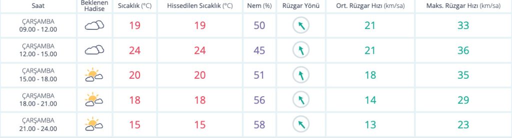 Meteoroloji Genel Müdürlüğü (MGM) günlük hava durumu raporuna göre; 12 Mart Çarşamba günü İzmir’de tüm günün güneşli olması bekleniyor. Sıcaklıkların gün içinde en düşük 15, en yüksek 24 derece olacağı günde hissedilen sıcaklık seviyesinin de maksimum 24 derece seviyelerinde seyir etmesi planlanıyor. Günlük nem dengesinin yüzde 58 seviyesinde seyir edeceği günde ortama rüzgar hızının saatte 21 maksimum rüzgar hızının ise saatte 36 kilometreye kadar çıkacağı öngörülüyor.