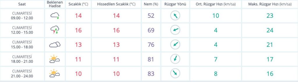 Meteoroloji Genel Müdürlüğü (MGM) günlük hava durumu raporuna göre; 12 Nisan Cumartesi günü İzmir’de sabah saatlerinde etkili olan sağanak sağış öğleden sonra yerini bulutlu havaya bırakması bekleniyor. Hava sıcaklıklarının gün içinde en düşük 10, en yüksek 16 derece olacağı günde hissedilen sıcaklık seviyesinin de maksimum 16 derece seviyelerinde seyir etmesi planlanıyor. Günlük nem dengesinin yüzde 83 seviyesinde seyir edeceği günde ortama rüzgar hızının saatte 10 maksimum rüzgar hızının ise saatte 24 kilometreye kadar çıkacağı öngörülüyor.