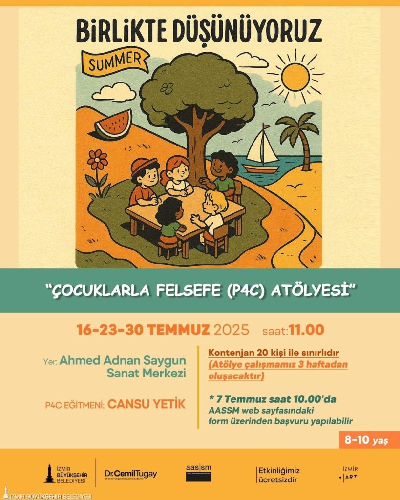 Düzenlediği atölyelerle hem çocuklara hem de yetişkinlere farklı deneyimler sunan İzmir Büyükşehir Belediyesi Ahmed Adnan Saygun Sanat Merkezi, bu kez 8-10 yaş arası çocuklara yönelik “Birlikte Düşünüyoruz Çocuklarla Felsefe (P4C) Atölyesi”ni hayata geçirecek. Eğitmen Cansu Yetik eşliğinde haftada bir gün olmak üzere üç hafta sürecek bu özel atölye, çocukların eleştirel, yaratıcı, iş birlikçi ve özenli düşünme becerilerini geliştirmeyi amaçlıyor. 16, 23, 30 Temmuz tarihlerinde saat 11.00’de gerçekleştirilecek ücretsiz atölyenin kontenjanı 20 kişiyle sınırlı tutuluyor.