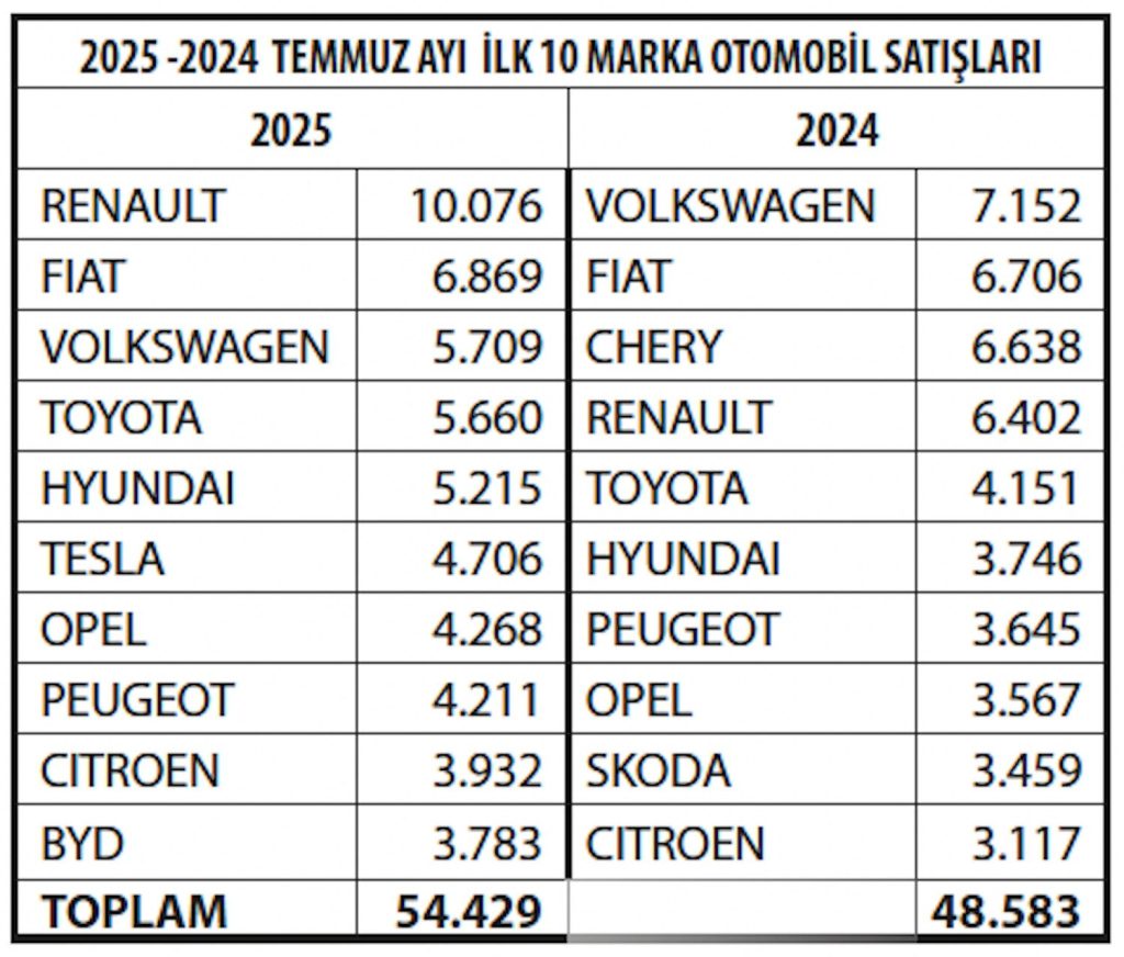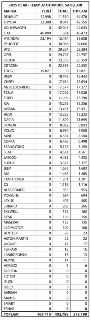 Ocak – Temmuz döneminde 64.578 adet ile Renault en çok satılan otomobil markası oldu. Derneğin sitesinden derlenen yandaki tabloda görülebileceği gibi, satılan toplam 572.198 aracın %11,29’u Renault markası altında satıldı. Toyota ikinci sırada 42.155 araç ile toplam satışların %7,37’sini oluştururken Volkswagen 42.043 araç satışı ile 3. sırada. 4. sırada 40.473 araç ile Fiat ve 5. sırada da 35.658 araç ile Hyundai yer alıyor. İlk 10 sırayı alan araçların toplam içindeki payı %62,73. Lüks Alman arabalarından BMW 18.443, Mercedes 17.377 ve Audi 13.232 adet olmak üzere toplam 49.052 araç sattı ve bu üç aracın toplam satışlar içindeki payı %8,57 oldu. BYD ise 29.284 araç satarak 7. sıradaki yerini korudu.