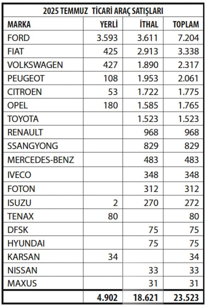 Hafif ticari araç satışları ise 2025 Temmuz ayında toplam 23.523 adet olarak gerçekleşti. 18.621’i ithal, 4.902’si ise yerli olan bu araçlarda ilk sırayı 7.204 adet ile Ford alıyor. Onu 3.338 adet ile Fiat takip ediyor. 4.902 olan yerli üretim adedinin 4.018’i FORD ve FIAT tarafından satılmış durumda. Volkswagen’in yerli üretimi devreye girdi ve Temmuzda 427 adet yerli üretim satıldı. Yerli Volkswagen Transporter modeli, 2018 yılında Ford ile Volkswagen arasında yapılan anlaşma kapsamında Ford Otosan tarafından Türkiye’de üretiliyor. Yerli marka TENAX da 80 adet satışla listede yer alıyor. TENAX komyonet ve panelvan üretimi yapıyor.