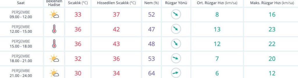 ŞEHİRLERDEN ŞEHİR HABERLERİ İzmir’de güncel hava durumu 14 Ağustos 2025 1 den az dakika Meteoroloji Genel Müdürlüğü’nün tahminlerine göre bugün İzmir’de 30 derece güneşli bir hava hakim olacak. Gündüz hissedilen sıcaklık 37 derecelere çıkarken akşam 34 derecelere düşüş yaşanacak. Paylaş FacebookTwitterPinterestWhatsAppTelegram Önceki İçerikMüzik aleti üreticileri enflasyon ve ithalat kıskacındaSonraki İçerikİzmir nöbetçi eczane listesi İLGİLİ HABERLER ŞEHİR HABERLERİ İzmir’in 8 ilçesinde sular kesilecek 25 Ekim 2025 ŞEHİR HABERLERİ İzmir’in güncel nöbetçi eczaneleri 25 Ekim 2025 ŞEHİR HABERLERİ İzmir’de güncel hava durumu 25 Ekim 2025 GÜNDEM İzmirliler sanata ‘kültür yolu’ ile doyacak 25 Ekim 2025 13 hava kampüsle sportif ve amatör havacılıkta yeni dönem 25 Ekim 2025 Cumhuriyetin 102. yılı İzmir’de coşkuyla kutlanacak 25 Ekim 2025 Bölge laboratuvarları her ilde hizmet verecek 25 Ekim 2025 Devamını Göster
