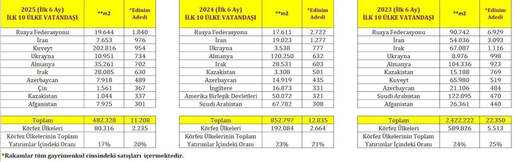 2025 yılı ilk 6 ay itibariyle, yabancıların Türkiye genelindeki toplam hisseye isabet eden yüzölçümü bazında tüm gayrimenkul yatırımları incelediğinde, yüzölçümü bazında ilk sırada Kuveyt yer alıyor. Kuveyt’i Almanya, Irak, Rusya Federasyonu, Ukrayna, Afganistan, Azerbaycan, İran, Çin ve Kazakistan takip ediyor. 2025 yılı ilk 6 ay itibariyle Türkiye genelinde yabancılara yapılan toplam gayrimenkul satış adetinde ise geçtiğimiz sene de ilk sırada yer alan Rusya Federasyonu ilk sırayı aldı. Rusya Federasyonu’nu İran, Kuveyt, Ukrayna, Almanya, Irak, Azerbaycan, Çin, Kazakistan ve Afganistan takip etti.