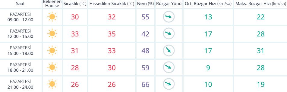 ŞEHİRLERDEN ŞEHİR HABERLERİ İzmir’de güncel hava durumu 1 Eylül 2025 1 den az dakika Meteoroloji Genel Müdürlüğü’nün tahminlerine göre bugün İzmir’de 29 derece güneşli bir hava hakim olacak. Gündüz hissedilen sıcaklık 32 derece, akşam 26 derece olacak ve rüzgarın ortalama hızı 13 km/sa olarak devam edecek. Paylaş FacebookTwitterPinterestWhatsAppTelegram Önceki İçerikSakıp Sabancı Uluslararası Araştırma Ödülleri’nin 2026 teması açıklandıSonraki İçerikİzmir nöbetçi eczane listesi İLGİLİ HABERLER ŞEHİR HABERLERİ İzmir’in 8 ilçesinde sular kesilecek 25 Ekim 2025 ŞEHİR HABERLERİ İzmir’in güncel nöbetçi eczaneleri 25 Ekim 2025 ŞEHİR HABERLERİ İzmir’de güncel hava durumu 25 Ekim 2025 GÜNDEM İzmirliler sanata ‘kültür yolu’ ile doyacak 25 Ekim 2025 13 hava kampüsle sportif ve amatör havacılıkta yeni dönem 25 Ekim 2025 Cumhuriyetin 102. yılı İzmir’de coşkuyla kutlanacak 25 Ekim 2025 Bölge laboratuvarları her ilde hizmet verecek 25 Ekim 2025 Devamını Göster