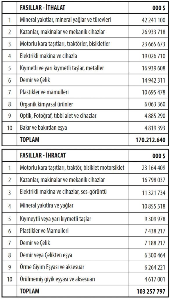 Mineral yakıtlar ve yağlar her yıl olduğu gibi ilk sırada ve toplam ithalatın yüzde 17,74’ünü oluşturuyor. İhracatımızda ise ilk 10 sırayı alan fasılların toplam ihracatımız içindeki payının ortalaması yüzde 58,00 ile yaklaşık geçen yılın seviyesinde. Motorlu kara taşıtları ihracatımız 23,164 milyar dolar ile ilk sırada yer alıyor ve ihracatımızın yüzde 13,01’ini oluşturuyor. Demir ve çelik İhracatımız 7,188 milyar dolar ile 7. sırada. Örülmüş ve örülmemiş giyim eşyası ve aksesuarları ihracatımız ise toplam 10,881 milyar dolar seviyesinde. Motorlu taşıtlarda
