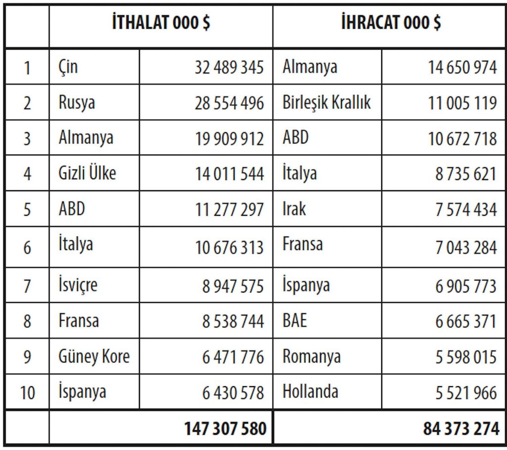 Buna mukabil Rusya’ya ihracatımız 4,299 milyar dolar, Çin’e ise 2,041 milyar dolar. Üçüncü sırada yer alan Almanya’dan ithalat 19,909 milyar dolar ile toplam ithalatın %,8,36’sını oluşturmakta. Gizli Ülke kategorisinde yer alan ithalatımız ise sıralamada 4. sırada ve 14,011 milyar dolar ile toplam ithalatın %5,88’ini oluşturuyor.