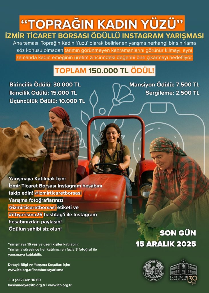 İzmir Ticaret Borsası’nın gelenekselleşen Instagram Fotoğraf Yarışması’nın bu yılki konusu ‘Toprağın Kadın Yüzü’ oldu. 1 Ekim-15 Aralık 2025 tarihleri arasında, ‘Toprağın Kadın Yüzü’ teması ile tek kategoride düzenlenen yarışmasına katılacak fotoğrafların içeriği, herhangi bir sınırlama söz konusu olmadan kadın emeğinin üretim zincirindeki değerini öne çıkarmayı hedefliyor. Ayrıca, kadınların tarım alanındaki alın teri, emeği, üretim koşulları ve kırsal yaşamın gerçek yüzünü anlatan tüm kareler yarışma içeriğine dahil edildi. Tek başlık altında düzenlenecek yarışmanın sergilemelerle birlikte toplam ödül miktarı ise 150 bin TL olarak belirlendi.