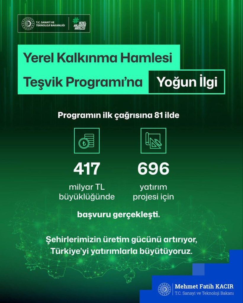Yerel Kalkınma Hamlesi Teşvik Planı’na yoğun ilgi gösterildi. 81 ilin tamamında 696 proje için 417 milyar TL büyüklüğünde yatırım yapıldı. Sanayi ve Teknoloji Bakanı Mehmet Fatih Kacır, Yerel Kalkınma Hamlesi Teşvik Planı ile ilgili konuştu. Bakan Kacır, her ilde dört öncelikli yatırım konusuna güçlü teşvikler sunduklarını belirterek, programın ilk çağrısına ülke genelinde yoğun ilgi gösterildiğini ifade etti. Kacır, “81 ilimizin tamamında, toplam 417 milyar TL’yi aşan yatırım tutarına sahip 696 proje başvurusu yapıldı” dedi.