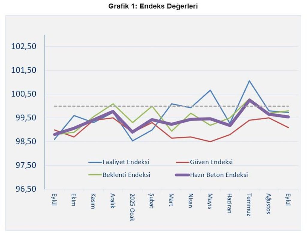 Türkiye Hazır Beton Birliği (THBB), her ay merakla beklenen inşaat ile bağlantılı imalat ve hizmet sektörlerindeki mevcut durum ile beklenen gelişmeleri gösteren ‘Hazır Beton Endeksi’ 2025 Eylül Ayı Raporu’nu açıkladı. Hazır Beton Endeksi 2025 Eylül Ayı Raporu’na göre, temmuz ayındaki zirveden sonra ağustosta eşik değerin altına gerileyen Faaliyet Endeksi, eylül ayında eşik değerin altındaki yatay hareketine devam etti. Beklenti ve Güven Endekslerinin her ikisi de yine negatif tarafta hareket etti. Beklentide görülen sınırlı artış, endeks değerini eşiğin üzerine taşımaya yeterli olmadı. Güven Endeksi ise eylül ayında geriledi. Son olarak birleşik Beton Endeksi de Güven Endeksi’ndeki azalışa paralel olarak düşüş kaydetti.