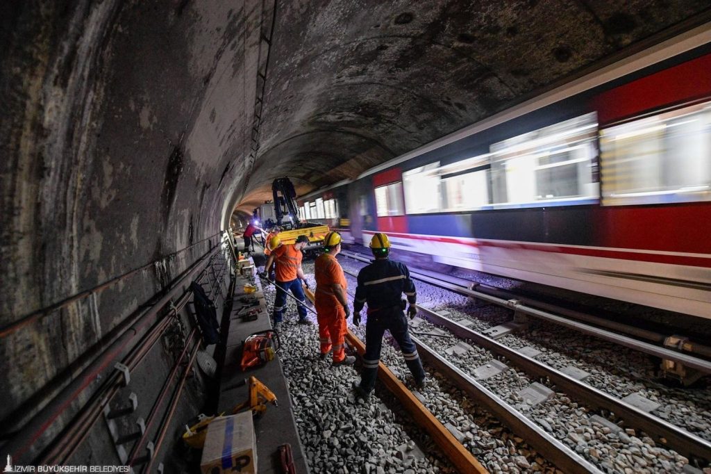 İzmir Büyükşehir Belediyesi, konforlu, güvenli ve sürdürülebilir ulaşım için çalışmalarını sürdürüyor. 24 istasyon ve 27 kilometrelik hat üzerinde yolcu taşıyan kent ulaşımının can damarı İzmir Metro AŞ seferlerin bittiği gece saatlerinde rayların bakımını ve değişimini yapıyor. Makas değişimi, taşlama gibi çalışmalar sabahın ilk ışıklarına kadar tamamlanıp hat sefere hazır hale getiriliyor.