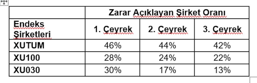 Üçüncü çeyrek bilanço sonuçları kârlılık daralmalarının yavaşladığını gösteriyor. BIST100’de zarar edenlerin oranı yüzde 24’ten yüzde 22’ye indi. Buna göre XUTUM endeksinde bilanço açıklayan 524 şirketin yüzde 58’i olan 303’ü kâr açıklarken, geri kalan şirketler zarar bildirdi. XU100’de zarar açıklayanların oranı yüzde 22, XU030’da ise yüzde 13’si seviyesinde oldu.