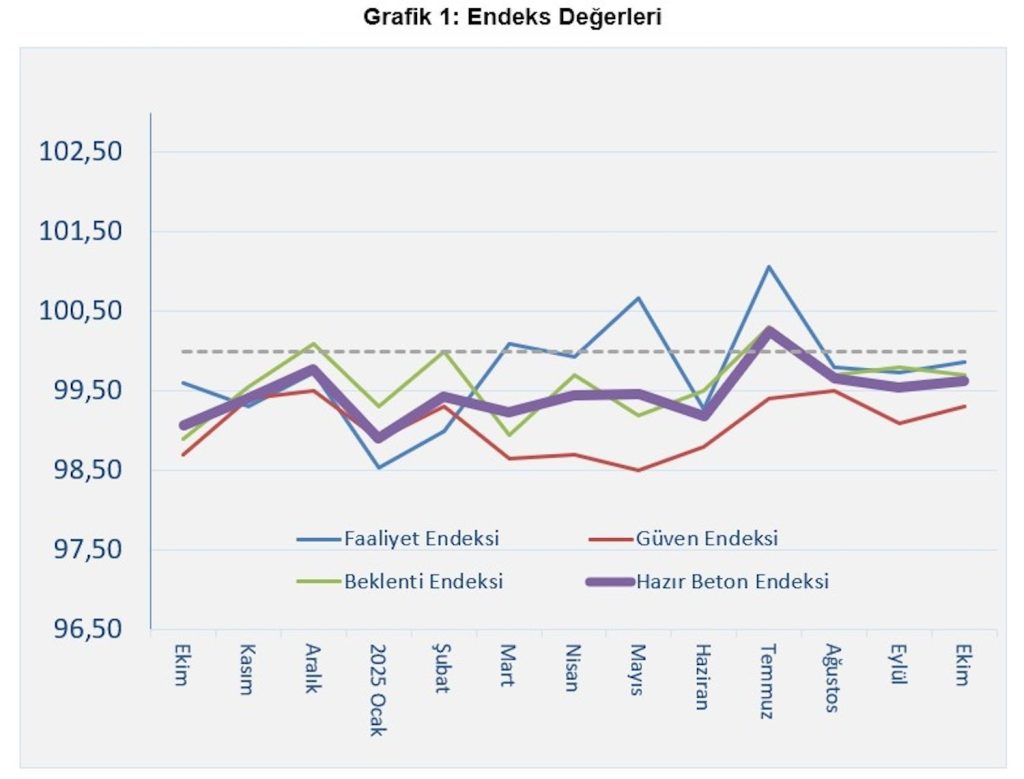 Hazır Beton Endeksi 2025 Ekim Ayı Raporu’na göre, ekim ayında endeks değerleri, eylül ayına oldukça yakın seyretti. Güven Endeksi hafif bir toparlanma sergilemiş olsa da değer olarak en düşük endeks durumunda. Faaliyet Endeksi sınırlı bir yükseliş, Beklenti Endeksi ise sınırlı bir azalış gösterdi. Son olarak Birleşik Beton Endeksi negatif tarafta kalarak bir önceki aya paralel bir hareket sergiledi.