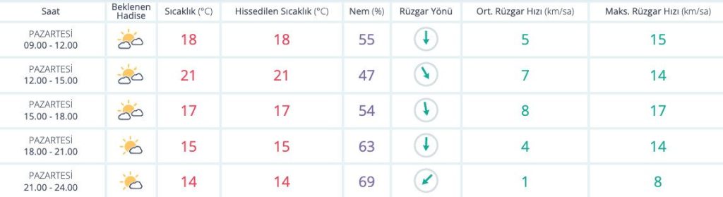ŞEHİRLERDEN ŞEHİR HABERLERİ İzmir’de güncel hava durumu 24 Kasım 2025 1 den az dakika Meteoroloji Genel Müdürlüğü’nün tahminlerine göre bugün İzmir’de 16 derece parçalı bulutlu bir hava hakim olacak. Yağışın beklenmediği bugün de, nem oranı ise yüzde 60 olacak. Paylaş FacebookTwitterPinterestWhatsAppTelegram Önceki İçerikEkonomi gündeminde hareketli hafta başlıyorSonraki İçerikAltın piyasasında dengeler değişti İLGİLİ HABERLER ŞEHİR HABERLERİ İzmir’de günün nöbetçi eczaneleri 24 Kasım 2025 ŞEHİR HABERLERİ İzmir Büyükşehir Belediyesi, Çin’e model oldu 22 Kasım 2025 ŞEHİR HABERLERİ İzmir’de bugün hangi ilçelerde sular kesilecek? 22 Kasım 2025 GÜNDEM İzmir’de günün nöbetçi eczaneleri 24 Kasım 2025 Altın piyasasında dengeler değişti 24 Kasım 2025 Ekonomi gündeminde hareketli hafta başlıyor 24 Kasım 2025 TİCARET’te bugün 24 Kasım 2025 Devamını Göster