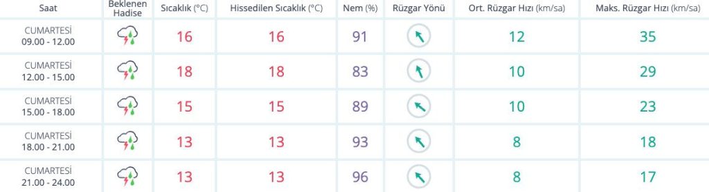 ŞEHİRLERDEN ŞEHİR HABERLERİ İzmir’de güncel hava durumu 29 Kasım 2025 1 den az dakika Meteoroloji Genel Müdürlüğü’nün tahminlerine göre bugün İzmir’de 13 derece gök gürültülü sağanak yağışlı bir hava hakim olacak. Nem oranı ise yüzde yüz seviyelerinde seyredecek. Paylaş FacebookTwitterPinterestWhatsAppTelegram Önceki İçerikAltın hala en güvenli liman Sonraki İçerikİzmir’de günün nöbetçi eczaneleri İLGİLİ HABERLER ŞEHİR HABERLERİ İzmir’de 7 ilçede su kesintisi olacak 29 Kasım 2025 ŞEHİR HABERLERİ İzmir’de günün nöbetçi eczaneleri 29 Kasım 2025 ŞEHİR HABERLERİ Torbalı, 30 belediyeye afete hazırlık eğitimi verecek 28 Kasım 2025 GÜNDEM Yaşar Müzesi’nin yönetimini bir günlüğüne çocuklar devraldı 29 Kasım 2025 IPARD’dan kırsal kalkınmaya %75 hibe 29 Kasım 2025 Esas Sosyal’den 10. yılda güçlü etki vurgusu 29 Kasım 2025 Japon şefler Türk yemeklerini öğrenerek mezun olacak 29 Kasım 2025 Devamını Göster