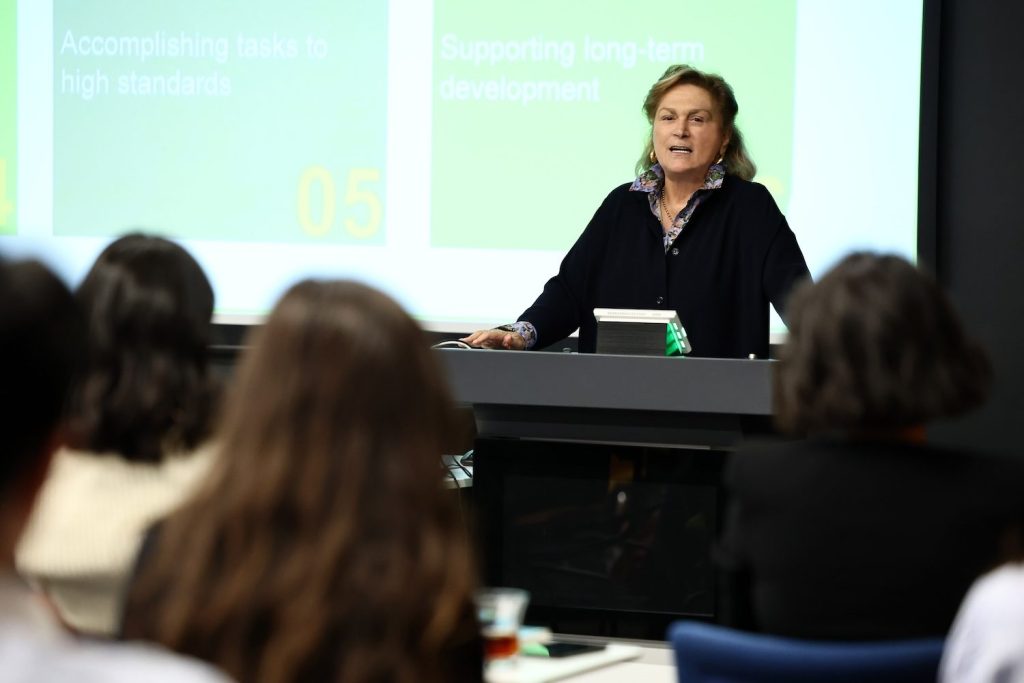 Yüksek lisans öğrencilerinin ilgiyle takip ettiği konuşmasında liderliğin geliştirilebilir bir beceri olduğunu vurgulayan Güler Sabancı, Sabancı Üniversitesi’nin kuruluş sürecinin kendisine “Daha çok dinleme, gerektiğinde bir adım geride durma ve tartışmaların olgunlaşmasını bekleme” becerilerini kazandırdığını belirtti. Güler Sabancı bunun yanı sıra kendisini dinleyen öğrencilere de sık sık geri bildirim almalarını, 360 derece ölçümlere önem vermeleri gerektiğini de hatırlattı.