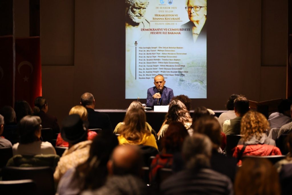Bu yıl “Demokrasi ve Cumhuriyete Felsefe ile Bakmak” başlığıyla düzenlenen Herakleitos ve İoanna Kuçuradi Felsefe Günleri’nin açılış oturumunda konuşan Efes Selçuk Belediye Başkan Vekili ve Başkan Yardımcısı Erhan Güzel, dijitalleşme ve yapay zekâ ile başlayan sürecin hayatı kolaylaştırmasına karşın günlük hayatta bireylerin düşünme, analiz etme ve muhakeme becerilerini olumsuz yönde de etkilemesi sebebiyle felsefenin ayrı bir önem kazandığına dikkat çekerek; “Felsefe bizim için analitik düşünce demek, mantık ve muhakeme demek. O yüzden Felsefe Kurumu’nun ve Efes Selçuk Belediyesi’nin 40 bin nüfuslu bu küçücük ilçede gerçekleştirmiş olduğu ve bu yıl da beşincisi gerçekleşecek olan felsefe günleri gerçekten çok önemli. Buna emek veren Felsefe Kurumu’na, kıymetli akademisyenlerimize, Efes Selçuk Belediye Başkanımız Filiz Ceritoğlu Sengel’e, meslektaşım İbrahim Depe hocama gerçekten teşekkürlerimi sunuyorum. Buraya bugün katılan ve dinlemeye gelen kıymetli dinleyicilere de hoş geldin diyorum” dedi.