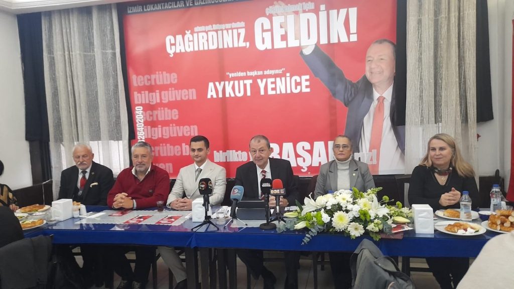 Aykut Yenice, İzmir Lokantacılar ve Gazinocular Odası Başkanlığına (İLGEO) adaylığını açıkladı. 5 dönem İzmir Lokantacılar ve Gazinocular Esnaf Odası Başkanlığı ve 3 dönem Türkiye Lokantacılar ve Pastacılar Federasyon Başkanlığı yapan Yenice, yeniden İLGEO’ya aday olduğunu duyurdu. 25 Ocak’ta yapılacak olan İzmir Lokantacılar ve Gazinocular Esnaf Odası Başkanlık seçimine yeniden aday olduğunu duyuran Yenice, esnafın “sıkıntımız çok, çözümü için size ihtiyaç var” dediğini dile getirdi.