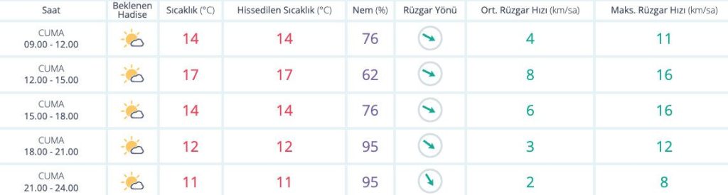 ŞEHİRLERDEN ŞEHİR HABERLERİ İzmir’de günün hava durumu 12 Aralık 2025 1 den az dakika Meteoroloji Genel Müdürlüğü’nün tahminlerine göre bugün İzmir’de 8 derece açık bir hava hakim olacak. Yağış beklenmezken nem oranı ise yüzde 82’lerde olacak. Paylaş FacebookXPinterestWhatsAppTelegram Önceki İçerikDöviz fiyatları bugün ne kadar?Sonraki İçerikİzmir’de günün nöbetçi eczane listesi İLGİLİ HABERLER ŞEHİR HABERLERİ İzmir’den Şanghay’a ilk ihracat blok treni yola çıktı 18 Nisan 2026 ŞEHİR HABERLERİ Üniversiteliler tiyatroda buluştu 18 Nisan 2026 ŞEHİR HABERLERİ İzBB’den Beydağ’a çok amaçlı modern hizmet kompleksi 18 Nisan 2026 GÜNDEM Şiddet eğilimi bazı belirtiler verebiliyor 19 Nisan 2026 Aydın Tokbaş: Su tarifesindeki %50 indirim turizmciler için çok kıymetli 18 Nisan 2026 Ege Tekstil ve Hammaddeleri İhracatçıları Birliği’nde Turan Göksan dönemi 18 Nisan 2026 İzmir’den Şanghay’a ilk ihracat blok treni yola çıktı 18 Nisan 2026 Devamını Göster