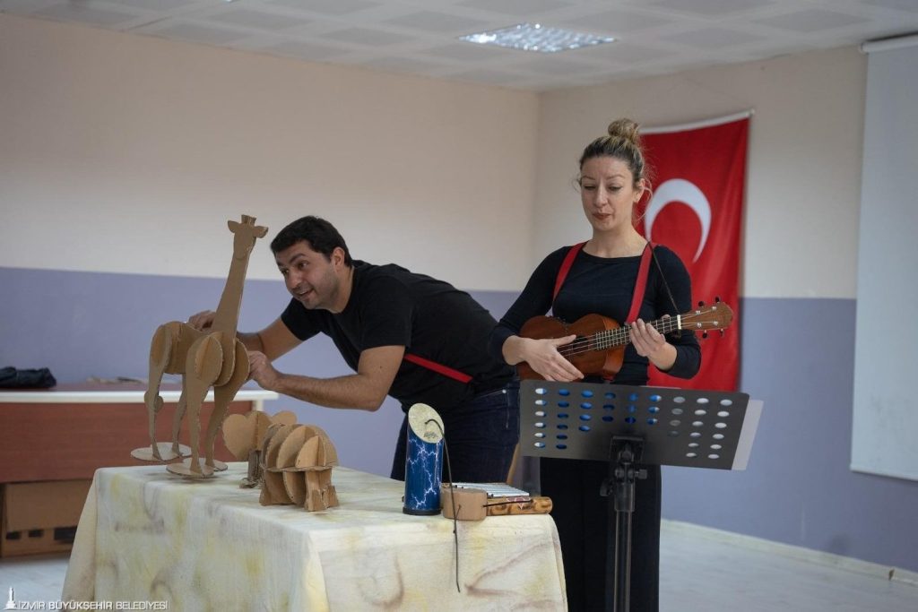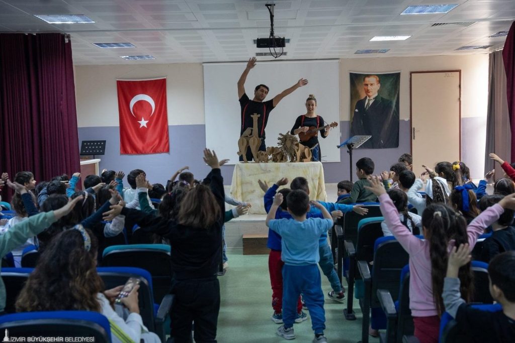 İzmir Şehir Tiyatroları’nın çocukları sanatla buluşturmak üzere Buca’da sahnelediği “Kendini Arayan Zürafa” oyununda, minikler oyunun şarkılarına hep bir ağızdan eşlik etti.