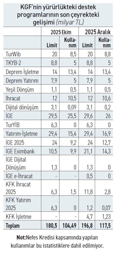 Kredi Garanti Fonu’nun yürürlükteki destek programlarının toplam büyüklüğü 2025 yılı sonu itibarıyla 200 milyar TL’ye yaklaştı. 2025 yılı son çeyreğinde genel destek programları kapsamında şirketlerin kredi kullanımı yaklaşık 13 milyar TL artarak 117,5 milyar TL’ye yükseldi.