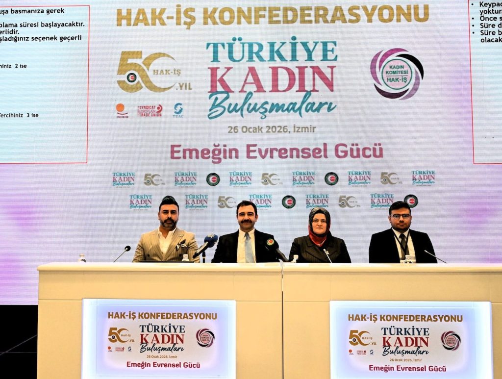 HAK-İŞ Konfederasyonu, 50. yıl etkinlikleri kapsamındaki “Türkiye Kadın Buluşmaları”nın ilkini “Çalışma Barışı, Sosyal Adalet ve Örgütlü Toplum” temasıyla İzmir’de gerçekleştirdi. Türkiye Kadın Buluşmaları’nda 8 ayrı masada kadınların çalışma hayatında karşılaştıkları sorunlar ve çözüm önerileri alanında uzman akademisyenler, sendikacılar ve temsilcilerin katılımıyla kapsamlı şekilde ele alındı.