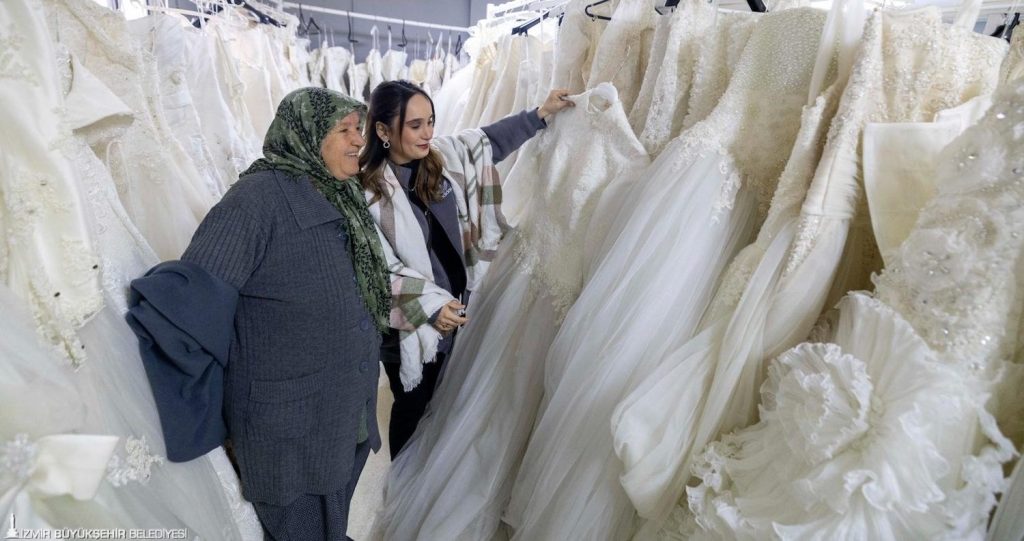 İzmir Büyükşehir Belediyesi, bağış yoluyla temin edilen gelinlik, damatlık ve abiye kıyafetleri ile ev tekstili ürünlerini evlilik hazırlığı yapan ihtiyaç sahibi çiftlere ücretsiz sunmaya başladı