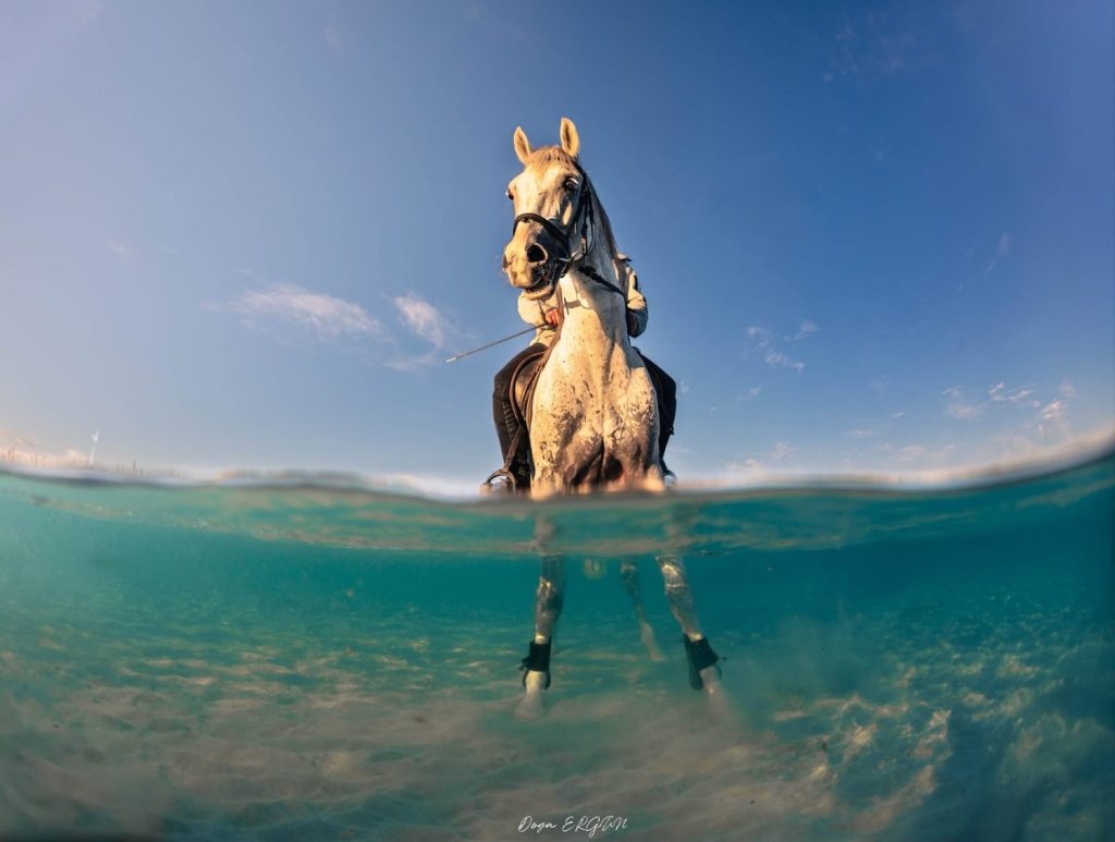 Yarışmada jüriyi etkileyen fotoğraf ise Altınkum Plajı’nda çekilen ve ‘split shot’ (yarı su altı–yarı su üstü) tekniğiyle oluşturulan at fotoğrafı oldu. Kara ve deniz yaşamını tek bir karede buluşturan fotoğraf, iki farklı dünyanın aslında birbirine bağlı olduğunu vurguluyor. Doğa Ergün, “Amacım sadece güzel bir kare yakalamak değil; denizlerin korunmasına dikkat çekmek ve doğaya verilen zararı görünür kılmak” sözleriyle fotoğrafa bakışını özetliyor.