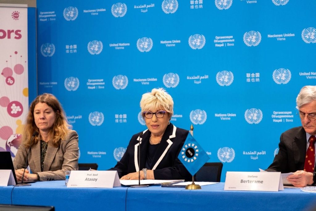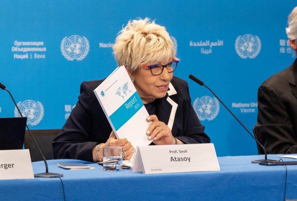 Birleşmiş Milletler Viyana Uluslararası Merkezi’nde (VIC) gerçekleşen basın toplantısında 2025 Yılı INCB Yıllık Raporu açıklandı. Prof. Dr. Sevil Atasoy, Uluslararası Uyuşturucu Kontrol Kurulu’nun (INCB), 2025 Yıllık Raporu’nda, uluslararası uyuşturucu kontrol sisteminin halk sağlığını korumada önemli bir rol oynamaya devam ettiğini kaydederek, “Bununla birlikte Kurul, sentetik uyuşturucuların, özellikle tıbbi olmayan sentetik opioidlerin hızla yayılması, yasa dışı üretim yöntemlerinin giderek daha karmaşık hale gelmesi ve temel kontrollü ilaçlara erişimdeki eşitsizliklerin devam etmesi gibi ciddi zorluklara dikkat çekmektedir” dedi.