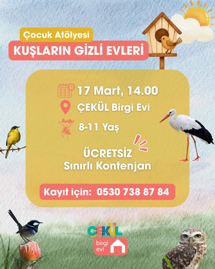 Çocuklar bu atölyede en sık karşılaştıkları kuşları yakından tanıyacak, kuşların doğanın dengesi içinde nasıl bir yerleri olduğunu, nerelerde yaşadıklarını öğrenip farklı kuş yuvası örneklerini inceleyecek ve kendi ahşap kuş evlerini yapacak. Doğayla bağ kuran, üreten ve keşfetmeyi öğreten bu ücretsiz eğitim için ÇEKÜL Birgi Çevre, Kültür ve Sanat Evi’ni arayarak yer ayırtılabiliyor.