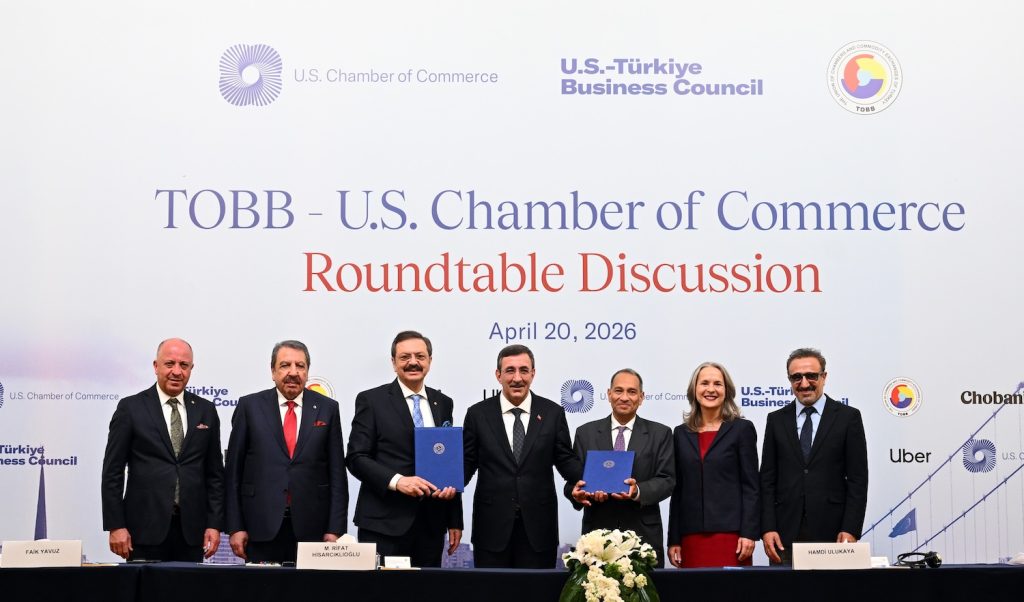 TOBB ve ABD Ticaret Odası Yuvarlak Masa Toplantısı, Cumhurbaşkanı Yardımcısı Cevdet Yılmaz, TOBB Başkanı M. Rifat Hisarcıklıoğlu, ABD Ticaret Odası Başkan Yardımcısı Khush Choksy ile ABD Ticaret Odası’na bağlı ABD-Türkiye İş Konseyi Başkanı ve Chobani’nin CEO’su Hamdi Ulukaya’nın katılımıyla TOBB İkiz Kuleler Kabul Salonu’nda yapıldı. Toplantıda TOBB ve ABD Ticaret Odası arasında iş birliği mutabakat zaptı imzalandı.